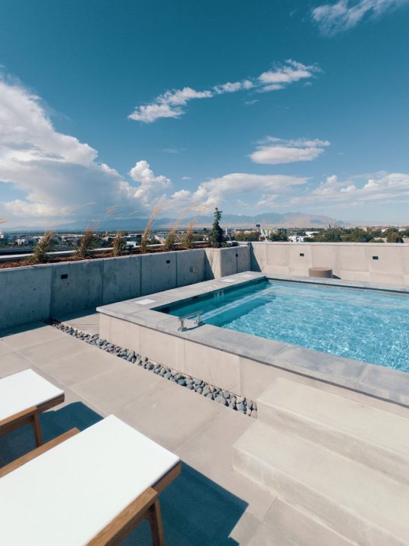 Enjoy rooftop luxury with our 50-person spa pool, chaise lounges, social seating, fire pits, and panoramic views.